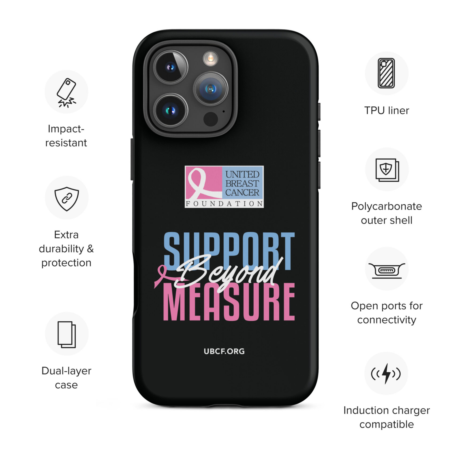 Purchases of this tough iPhone case directly supports individuals and families affected by breast cancer.  Your generosity fuels UBCF’s vital programs—providing financial aid, emotional support, and essential resources so those impacted by breast cancer can face each day with strength and hope.